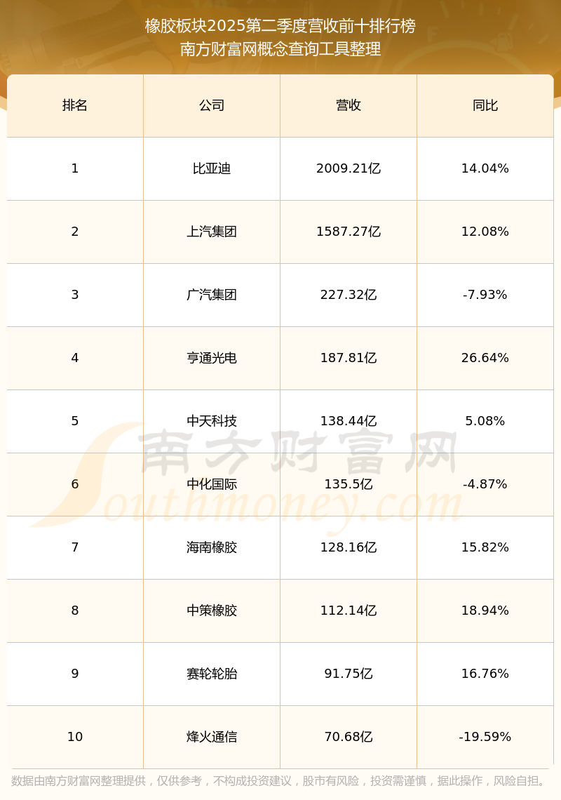 按照南方財(cái)富網(wǎng)概念查詢(xún)工具統(tǒng)計(jì),該股所屬板塊為橡膠板塊,該板塊共有57只股票,三維股份2025第二季度營(yíng)收在該板塊中排名為第26名,該板塊2025第二季度營(yíng)收排名前十的股票如下表: