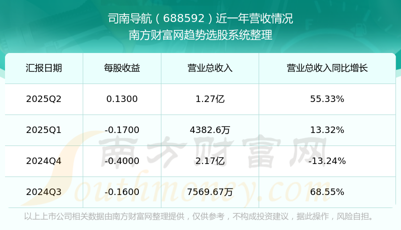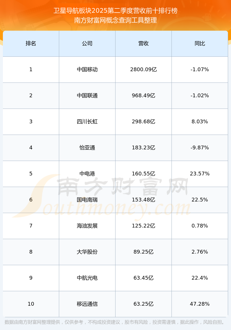 按照南方財富網(wǎng)概念查詢工具統(tǒng)計,該股所屬板塊為衛(wèi)星導航板塊,該板塊共有220只股票,司南導航2025第二季度營收在該板塊中排名為第171名,該板塊2025第二季度營收排名前十的股票如下表: