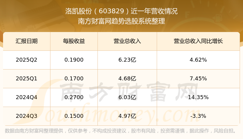 洛凱股份2025年第二季度顯示,公司主營收入6.23億元,同比4.62%;歸母凈利潤2921.41萬元,同比-28.38%;扣非凈利潤2863.11萬元,同比-24.86%;
