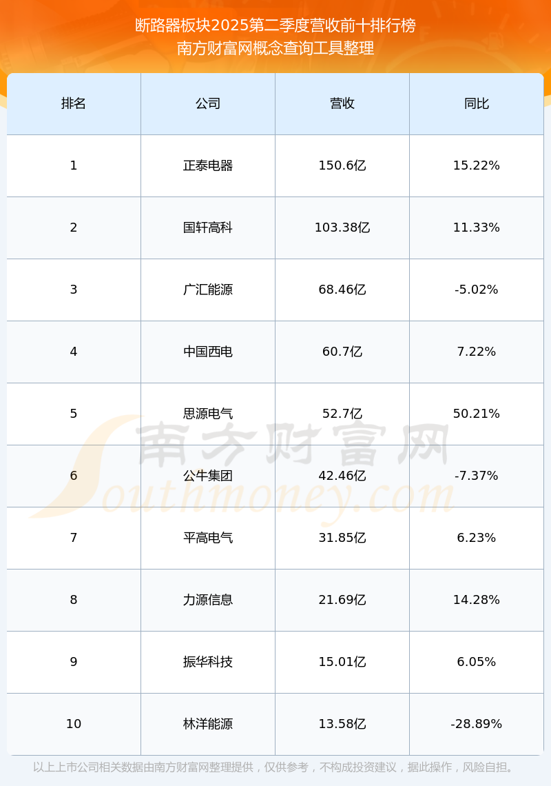 按照南方財富網(wǎng)概念查詢工具統(tǒng)計,該股所屬板塊為斷路器板塊,該板塊共有30只股票,洛凱股份2025第二季度營收在該板塊中排名為第18名,該板塊2025第二季度營收排名前十的股票如下表: