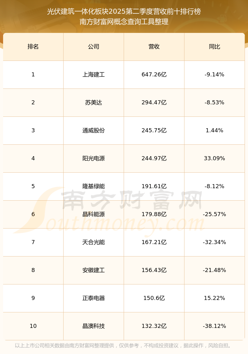 按照南方財(cái)富網(wǎng)概念查詢工具統(tǒng)計(jì),該股所屬板塊為光伏建筑一體化板塊,該板塊共有87只股票,隆基綠能2025第二季度營收在該板塊中排名為第5名,該板塊2025第二季度營收排名前十的股票如下表: