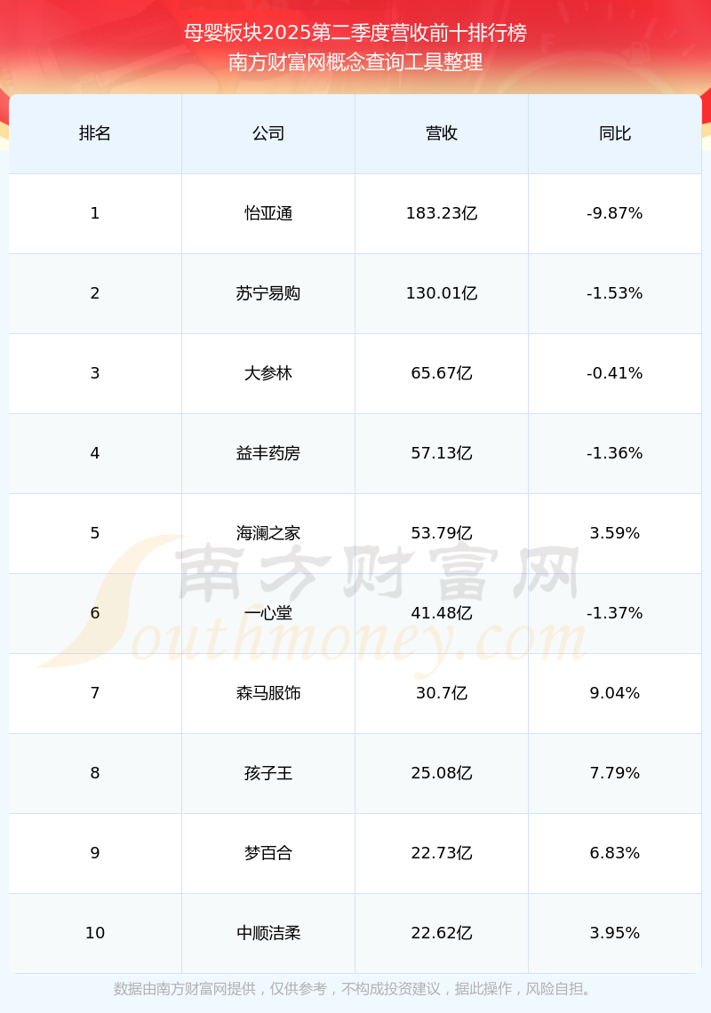 按照南方財富網概念查詢工具統(tǒng)計,該股所屬板塊為母嬰板塊,該板塊共有30只股票,上海家化2025第二季度營收在該板塊中排名為第30名,該板塊2025第二季度營收排名前十的股票如下表: