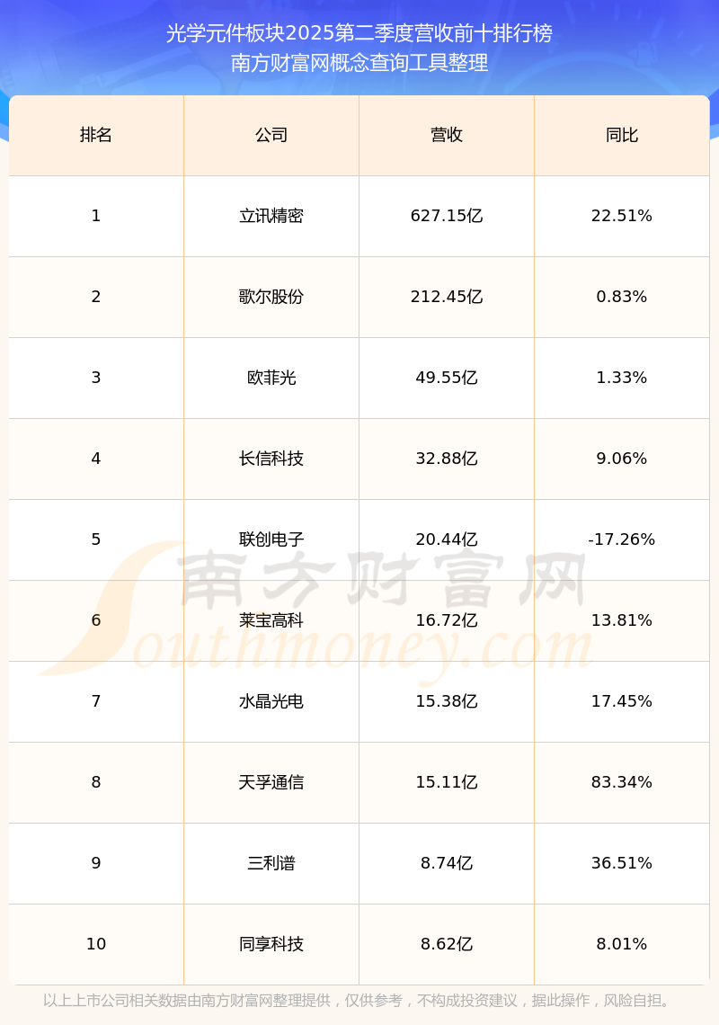 按照南方財(cái)富網(wǎng)概念查詢工具統(tǒng)計(jì),該股所屬板塊為光學(xué)元件板塊,該板塊共有47只股票,永新光學(xué)2025第二季度營(yíng)收在該板塊中排名為第32名,該板塊2025第二季度營(yíng)收排名前十的股票如下表: