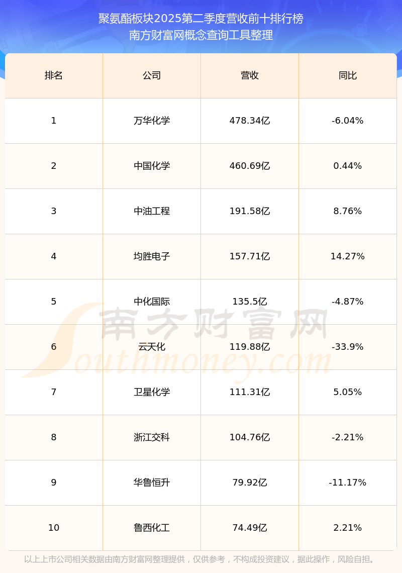 按照南方財富網(wǎng)概念查詢工具統(tǒng)計,該股所屬板塊為聚氨酯板塊,該板塊共有55只股票,匯得科技2025第二季度營收在該板塊中排名為第39名,該板塊2025第二季度營收排名前十的股票如下表: