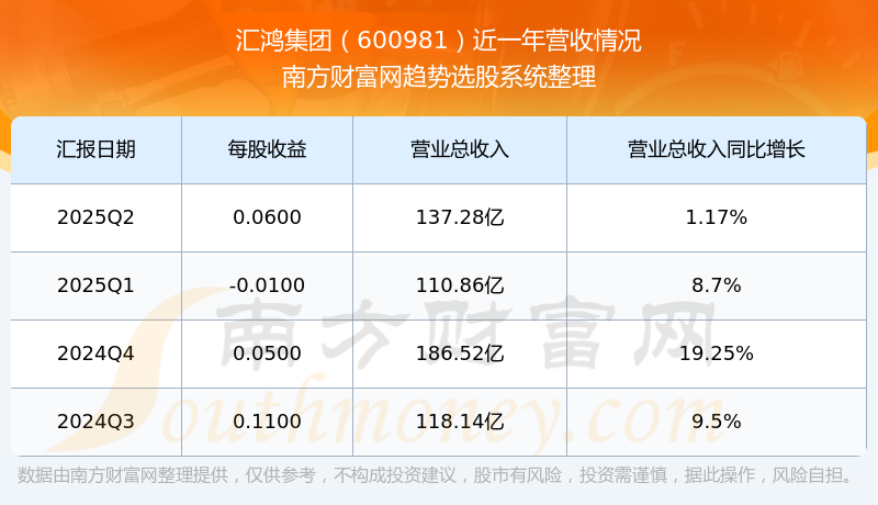 匯鴻集團(tuán)2025年第二季度公司實(shí)現(xiàn)營(yíng)業(yè)收入137.28億元,同比1.17%;歸母凈利潤(rùn)1.24億元,同比166.65%。