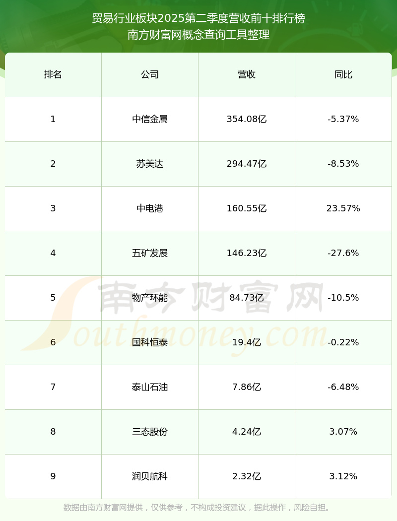 按照南方財(cái)富網(wǎng)概念查詢工具統(tǒng)計(jì),該股所屬板塊為貿(mào)易行業(yè)板塊,該板塊共有9只股票,匯鴻集團(tuán)2025第二季度營(yíng)收在該板塊中排名為第9名,該板塊2025第二季度營(yíng)收排名前十的股票如下表: