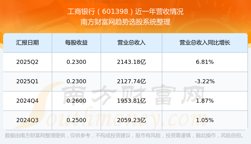 工商銀行2025年第二季度顯示,公司主營(yíng)收入2143.18億元,同比6.81%;歸母凈利潤(rùn)839.47億元,同比1.37%;扣非凈利潤(rùn)838.48億元,同比2.09%。