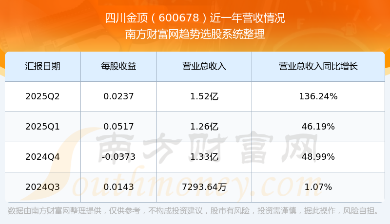 四川金頂2025年第二季度顯示,公司主營收入1.52億元,同比136.24%;歸母凈利潤827.36萬元,同比304.14%;扣非凈利潤1145.24萬元,同比423.6%。