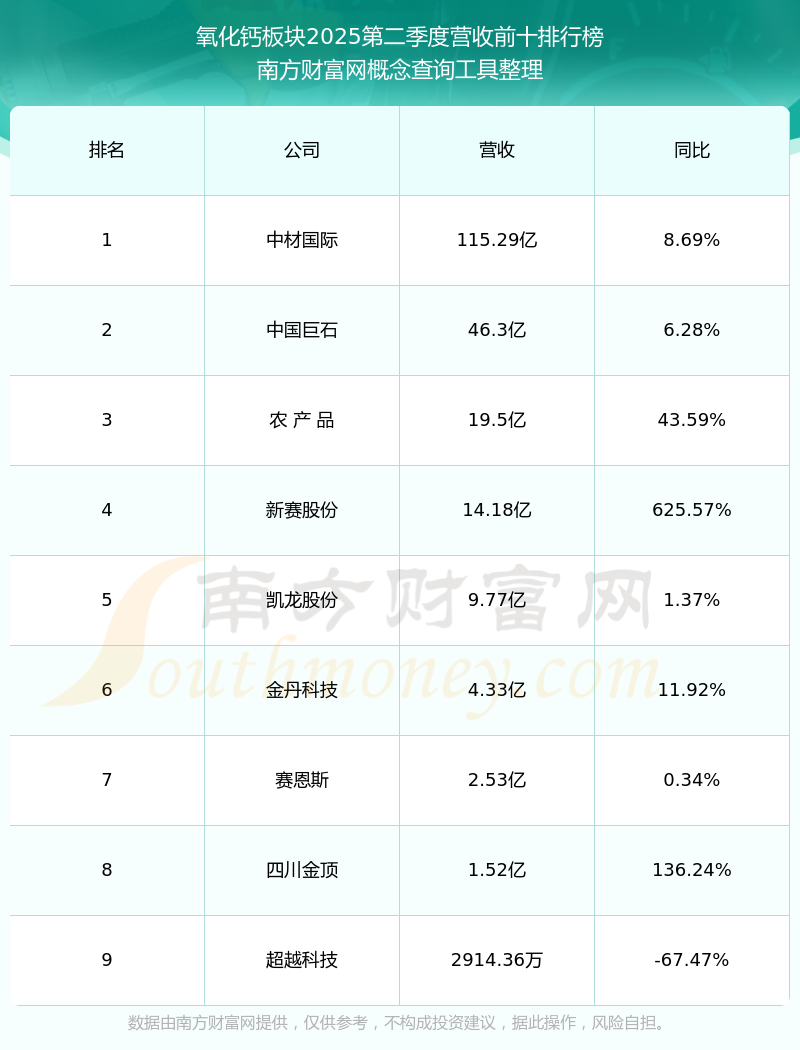 按照南方財富網概念查詢工具統(tǒng)計,該股所屬板塊為氧化鈣板塊,該板塊共有9只股票,四川金頂2025第二季度營收在該板塊中排名為第8名,該板塊2025第二季度營收排名前十的股票如下表:
