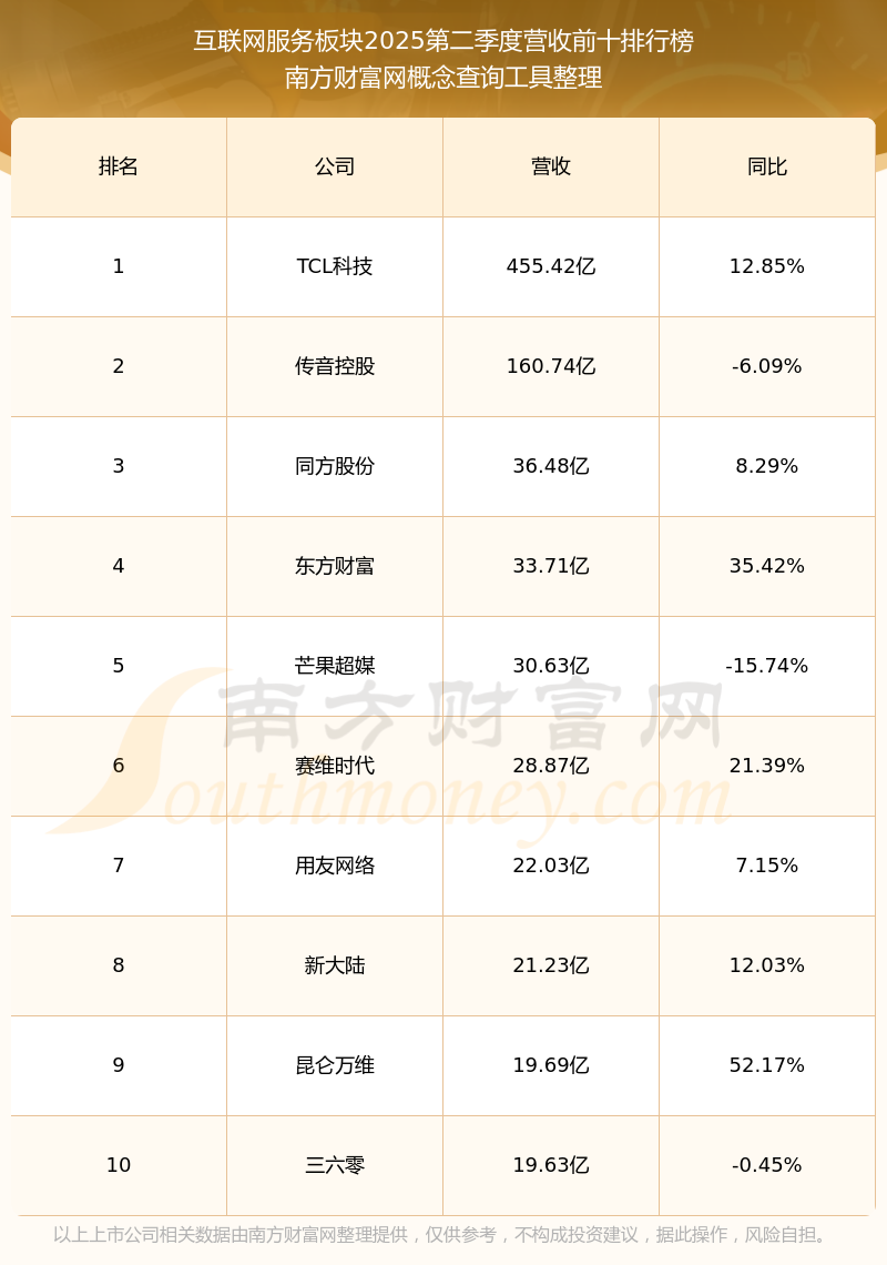 按照南方財富網(wǎng)概念查詢工具統(tǒng)計,該股所屬板塊為互聯(lián)網(wǎng)服務(wù)板塊,該板塊共有52只股票,浙大網(wǎng)新2025第二季度營收在該板塊中排名為第52名,該板塊2025第二季度營收排名前十的股票如下表: