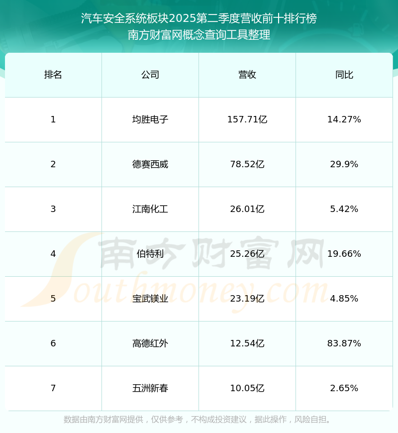 按照南方財富網(wǎng)概念查詢工具統(tǒng)計,該股所屬板塊為汽車安全系統(tǒng)板塊,該板塊共有7只股票,均勝電子2025第二季度營收在該板塊中排名為第1名,該板塊2025第二季度營收排名前十的股票如下表: