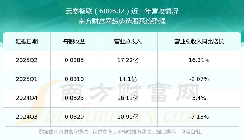 云賽智聯(lián)2025年第二季度顯示,公司主營(yíng)收入17.22億元,同比16.31%;歸母凈利潤(rùn)5289.13萬(wàn)元,同比-1.46%;扣非凈利潤(rùn)4322.87萬(wàn)元,同比-0.89%;