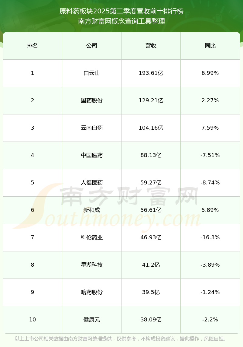 按照南方財(cái)富網(wǎng)概念查詢工具統(tǒng)計(jì),該股所屬板塊為原料藥板塊,該板塊共有121只股票,艾力斯2025第二季度營(yíng)收在該板塊中排名為第121名,該板塊2025第二季度營(yíng)收排名前十的股票如下表: