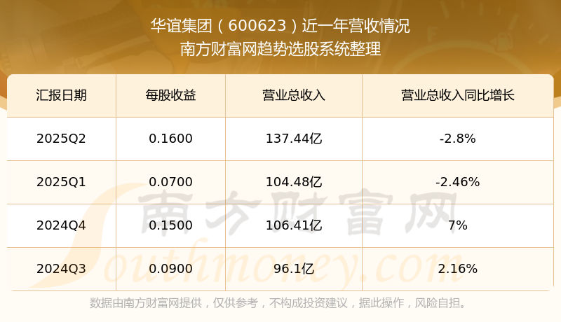華誼集團(600623)發(fā)布2025年第二季度財報。2025年第二季度華誼集團實現(xiàn)營業(yè)收入137.44億元,同比增加-2.8元%,環(huán)比增加31.55%;凈利潤為3.46億元,同比增長2.7%,環(huán)比增長142.95%。