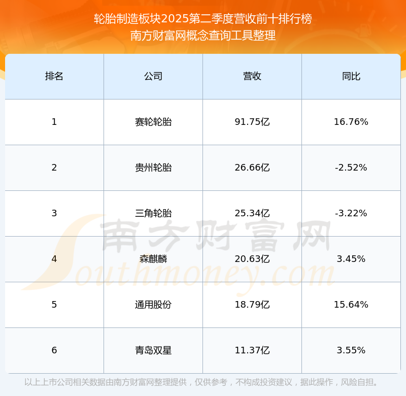 按照南方財富網(wǎng)概念查詢工具統(tǒng)計,該股所屬板塊為輪胎制造板塊,該板塊共有6只股票,華誼集團2025第二季度營收在該板塊中排名為第6名,該板塊2025第二季度營收排名前十的股票如下表:
