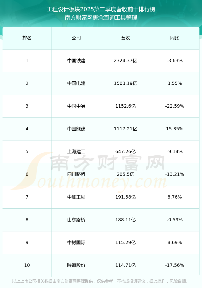按照南方財富網(wǎng)概念查詢工具統(tǒng)計,該股所屬板塊為工程設(shè)計板塊,該板塊共有78只股票,中國瑞林2025第二季度營收在該板塊中排名為第37名,該板塊2025第二季度營收排名前十的股票如下表: