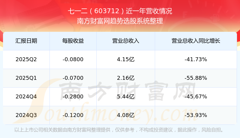 七一二2025年第二季度顯示,公司主營(yíng)收入4.15億元,同比-41.73%;歸母凈利潤(rùn)-6021.8萬(wàn)元,同比-217.94%;扣非凈利潤(rùn)-7080.2萬(wàn)元,同比-254.17%;