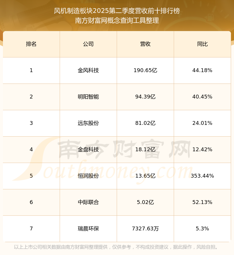 按照南方財富網(wǎng)概念查詢工具統(tǒng)計,該股所屬板塊為風機制造板塊,該板塊共有7只股票,吉鑫科技2025第二季度營收在該板塊中排名為第7名,該板塊2025第二季度營收排名前十的股票如下表: