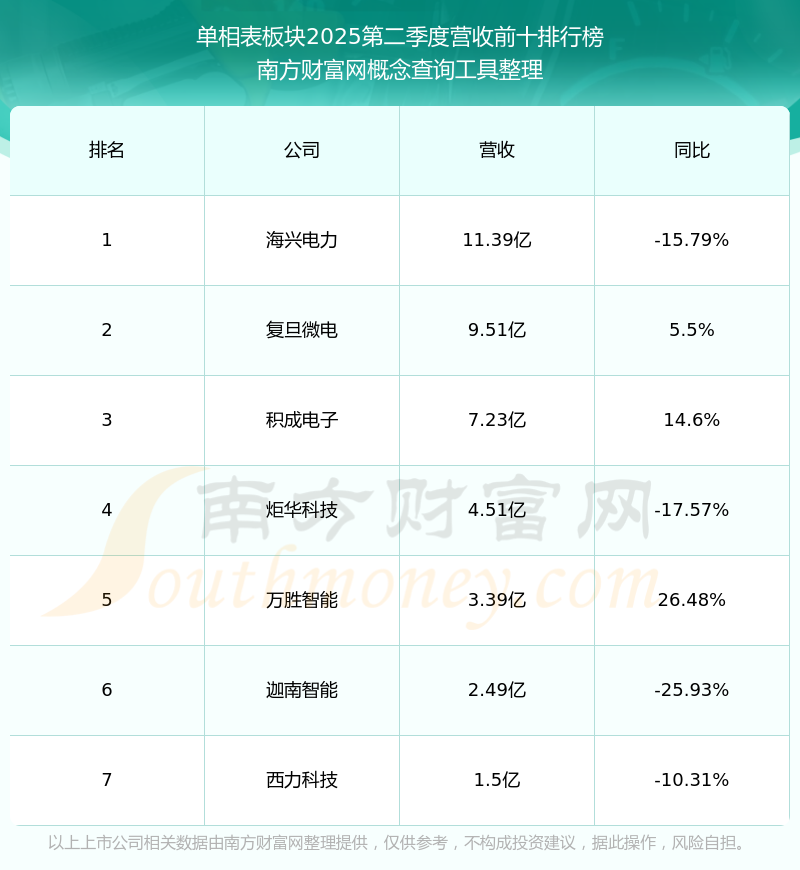 按照南方財(cái)富網(wǎng)概念查詢工具統(tǒng)計(jì),該股所屬板塊為單相表板塊,該板塊共有7只股票,西力科技2025第二季度營(yíng)收在該板塊中排名為第7名,該板塊2025第二季度營(yíng)收排名前十的股票如下表: