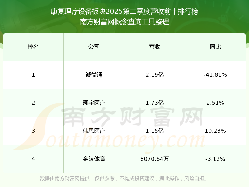 按照南方財(cái)富網(wǎng)概念查詢工具統(tǒng)計(jì),該股所屬板塊為康復(fù)理療設(shè)備板塊,該板塊共有4只股票,翔宇醫(yī)療2025第二季度營(yíng)收在該板塊中排名為第2名,該板塊2025第二季度營(yíng)收排名前十的股票如下表: