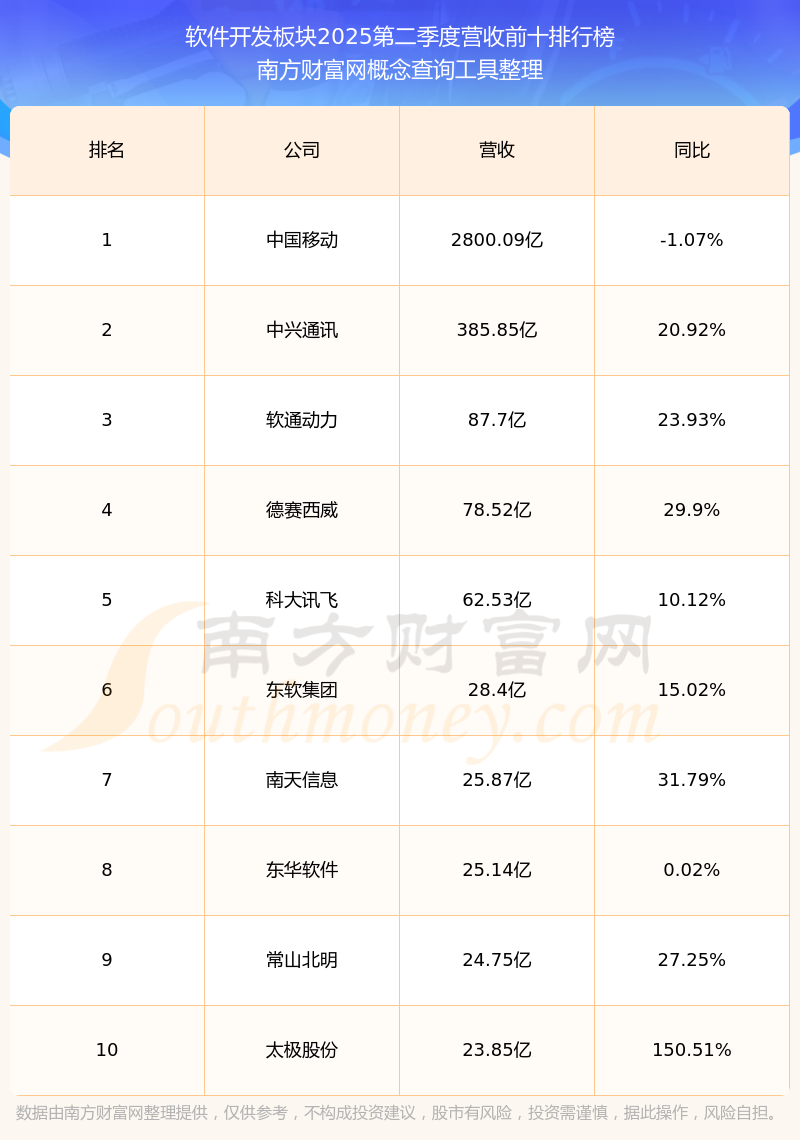 按照南方財(cái)富網(wǎng)概念查詢工具統(tǒng)計(jì),該股所屬板塊為軟件開發(fā)板塊,該板塊共有196只股票,浩辰軟件2025第二季度營(yíng)收在該板塊中排名為第146名,該板塊2025第二季度營(yíng)收排名前十的股票如下表: