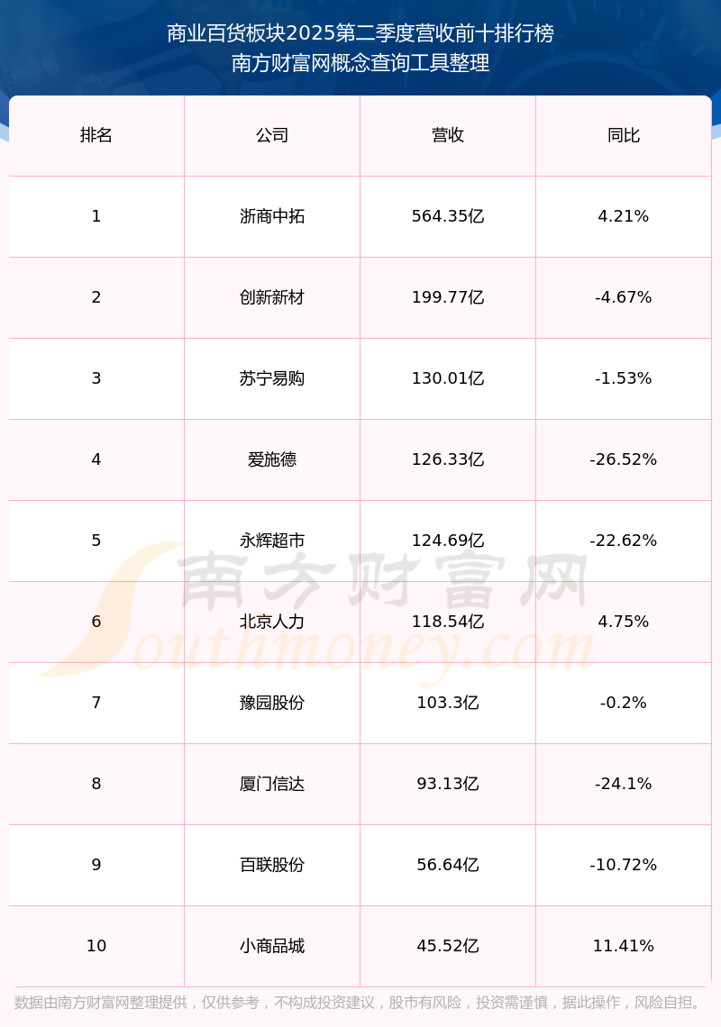 按照南方財富網(wǎng)概念查詢工具統(tǒng)計,該股所屬板塊為商業(yè)百貨板塊,該板塊共有75只股票,漢商集團2025第二季度營收在該板塊中排名為第58名,該板塊2025第二季度營收排名前十的股票如下表: