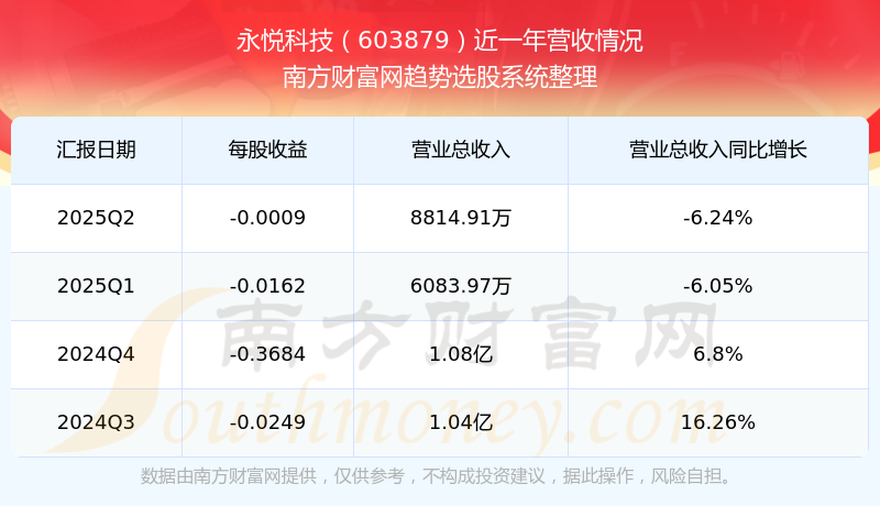 A股上市公司永悅科技(代碼:603879)發(fā)布2025年第二季度財報,公司2025年第二季度歸屬于上市公司股東的凈利潤為-33.79萬元,凈利潤同比增長97.35%,環(huán)比增長94.21%。
