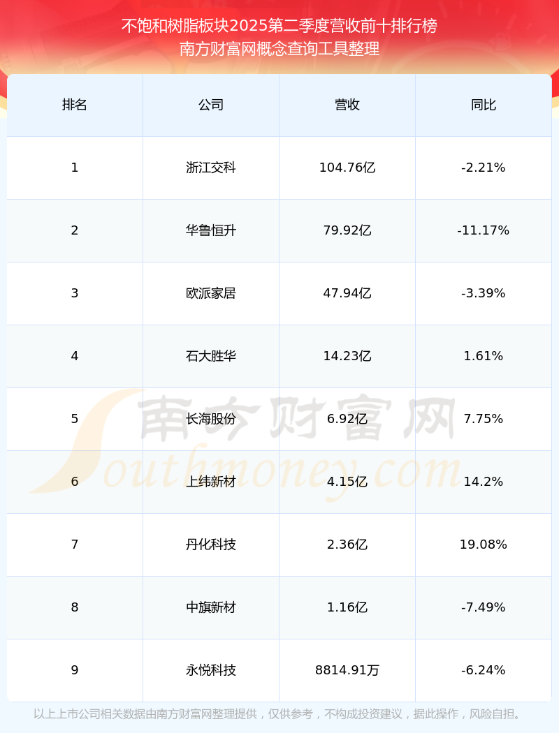 按照南方財富網(wǎng)概念查詢工具統(tǒng)計,該股所屬板塊為不飽和樹脂板塊,該板塊共有9只股票,永悅科技2025第二季度營收在該板塊中排名為第9名,該板塊2025第二季度營收排名前十的股票如下表: