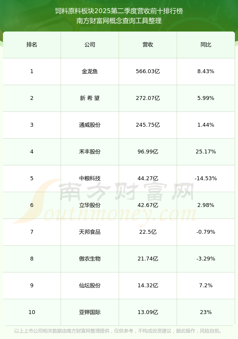 按照南方財(cái)富網(wǎng)概念查詢工具統(tǒng)計(jì),該股所屬板塊為飼料原料板塊,該板塊共有12只股票,邦基科技2025第二季度營(yíng)收在該板塊中排名為第12名,該板塊2025第二季度營(yíng)收排名前十的股票如下表: