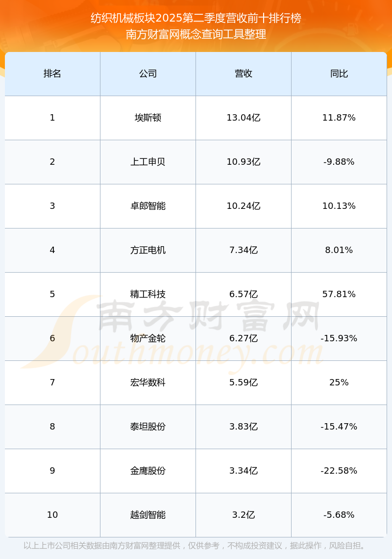 按照南方財(cái)富網(wǎng)概念查詢工具統(tǒng)計(jì),該股所屬板塊為紡織機(jī)械板塊,該板塊共有14只股票,越劍智能2025第二季度營收在該板塊中排名為第10名,該板塊2025第二季度營收排名前十的股票如下表: