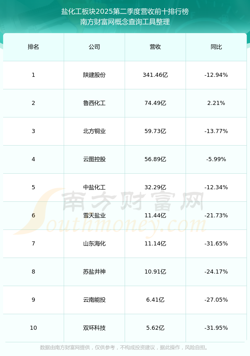 按照南方財富網(wǎng)概念查詢工具統(tǒng)計,該股所屬板塊為鹽化工板塊,該板塊共有11只股票,江鹽集團2025第二季度營收在該板塊中排名為第11名,該板塊2025第二季度營收排名前十的股票如下表: