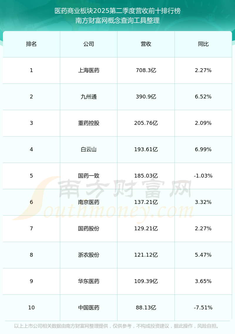 按照南方財(cái)富網(wǎng)概念查詢工具統(tǒng)計(jì),該股所屬板塊為醫(yī)藥商業(yè)板塊,該板塊共有62只股票,中國(guó)醫(yī)藥2025第二季度營(yíng)收在該板塊中排名為第10名,該板塊2025第二季度營(yíng)收排名前十的股票如下表: