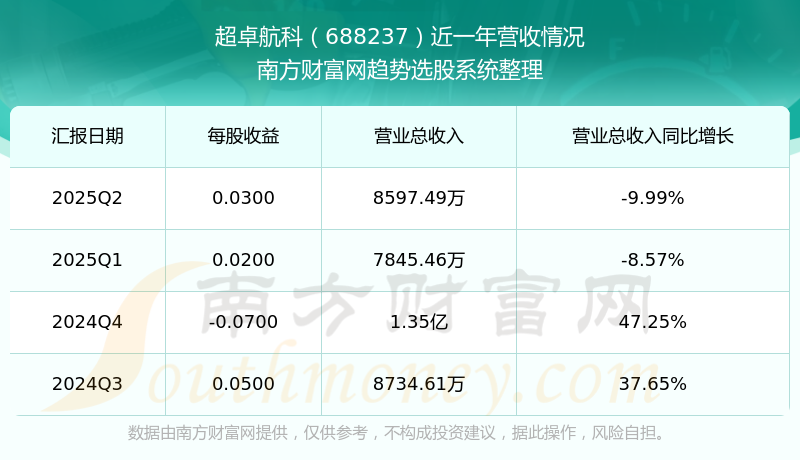 超卓航科2025年第二季度財報顯示,公司主營收入8597.49萬元,同比-9.99%;歸母凈利潤227.46萬元,同比220.74%;扣非凈利潤-66.62萬元,同比68.1%;