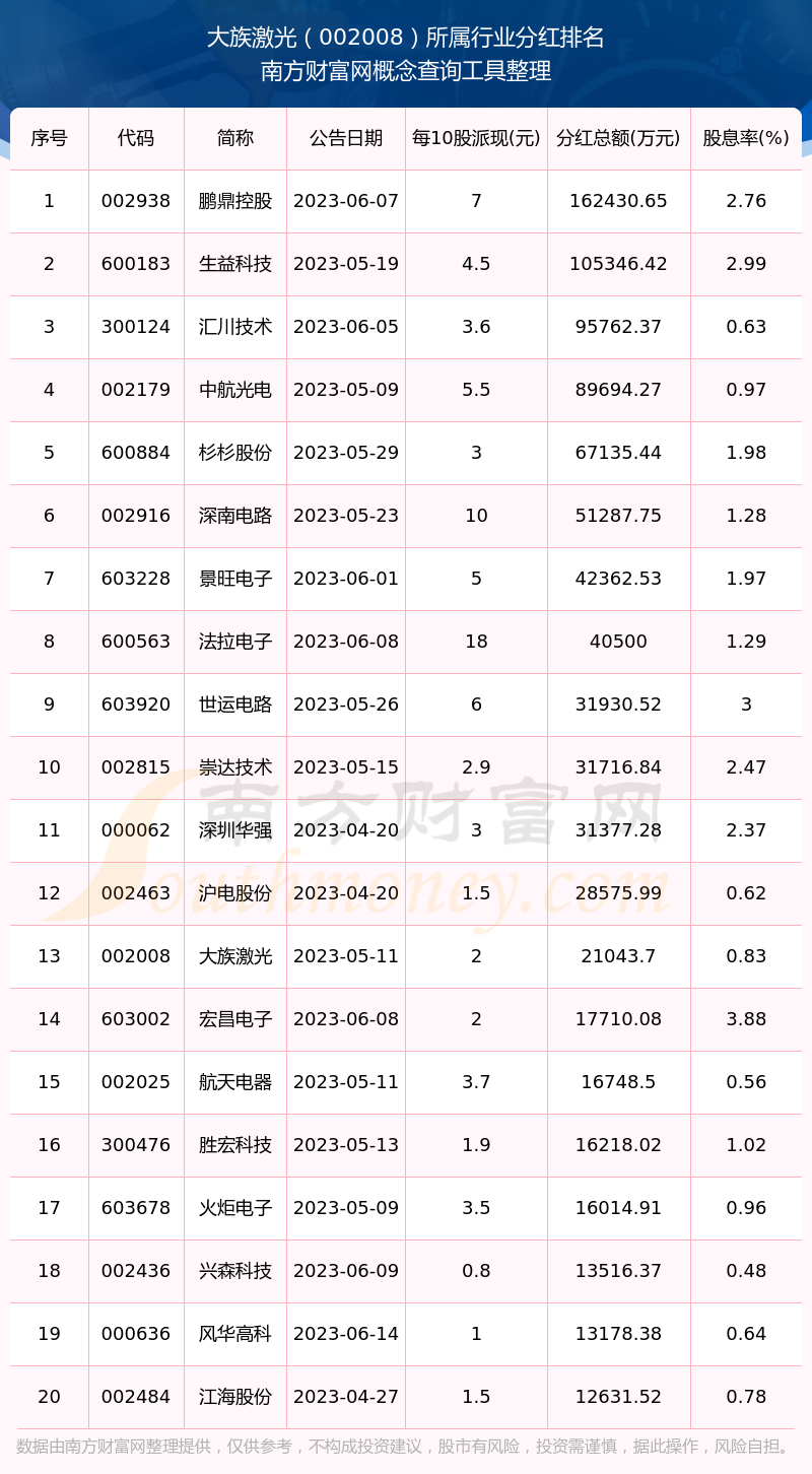 按照南方財富網(wǎng)趨勢選股系統(tǒng)統(tǒng)計,大族激光所屬行業(yè)為電子元件行業(yè),電子元件行業(yè)分紅排名情況如下表: