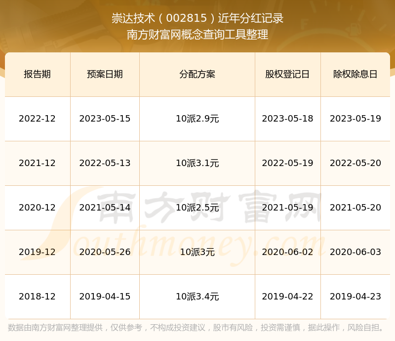 崇達技術最新一次公布的分紅方案為10派2.9元。本次權益分派股權登記日為2023年5月18日,除權除息日為2023年5月19日,派息日為2023年5月19日。