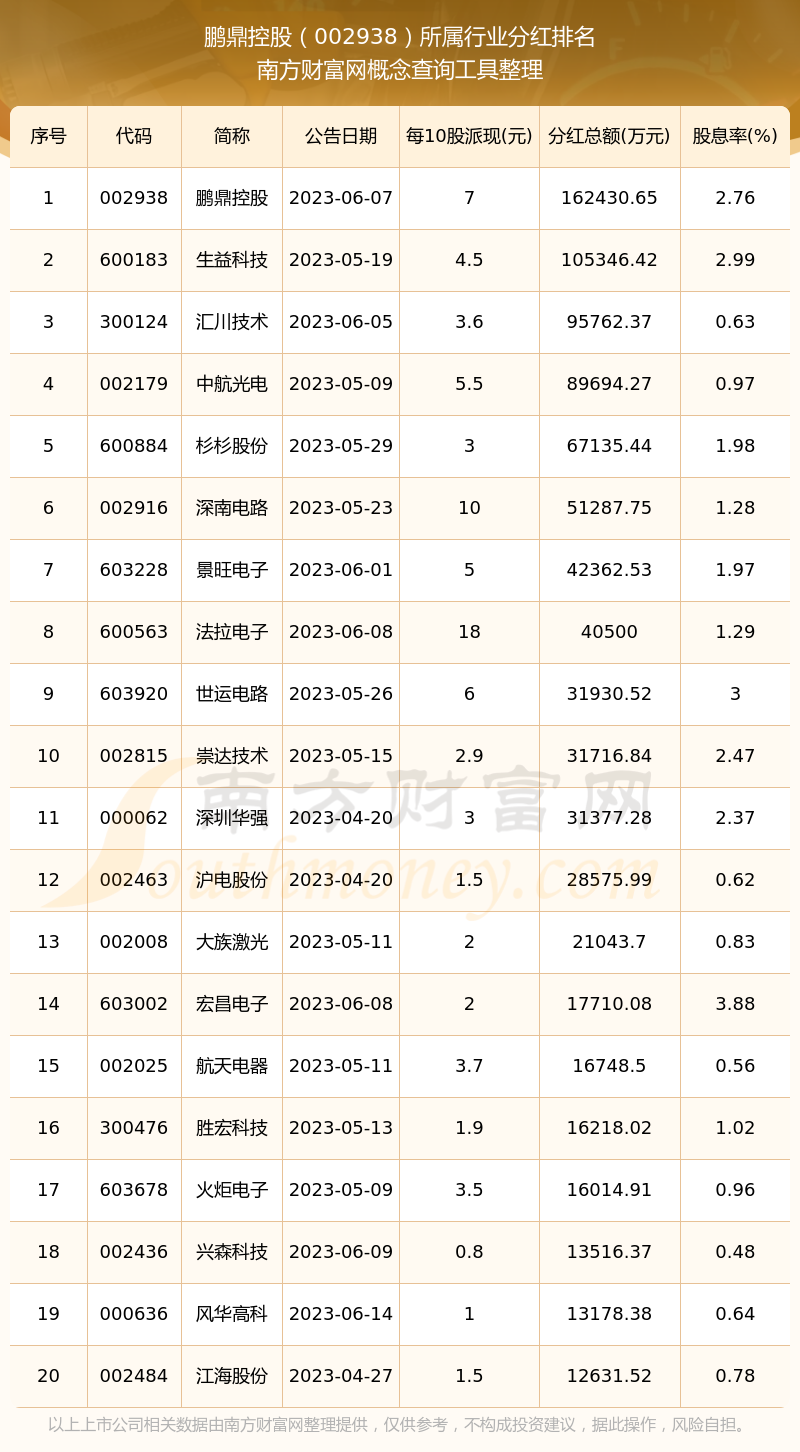 按照南方財(cái)富網(wǎng)趨勢(shì)選股系統(tǒng)統(tǒng)計(jì),鵬鼎控股所屬行業(yè)為印制電路板行業(yè),印制電路板行業(yè)分紅排名情況如下表:
