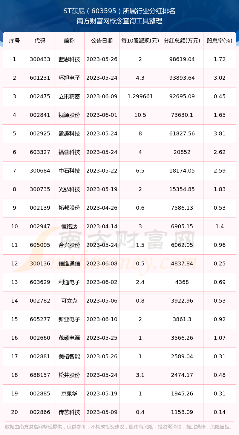 按照南方財(cái)富網(wǎng)趨勢(shì)選股系統(tǒng)統(tǒng)計(jì),ST東尼所屬行業(yè)為消費(fèi)電子行業(yè),消費(fèi)電子行業(yè)分紅排名情況如下表: