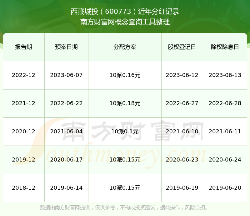 西藏城投最新一次公布的分紅方案為10派0.16元。本次權(quán)益分派股權(quán)登記日為2023年6月12日,除權(quán)除息日為2023年6月13日,派息日為2023年6月13日。