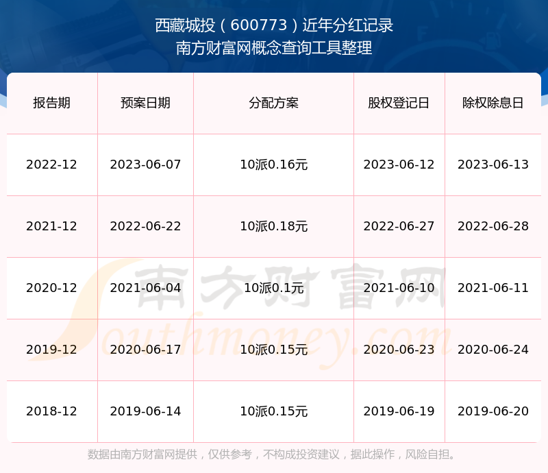 西藏城投最新一次公布的分紅方案為10派0.16元。本次權(quán)益分派股權(quán)登記日為2023年6月12日,除權(quán)除息日為2023年6月13日,派息日為2023年6月13日。