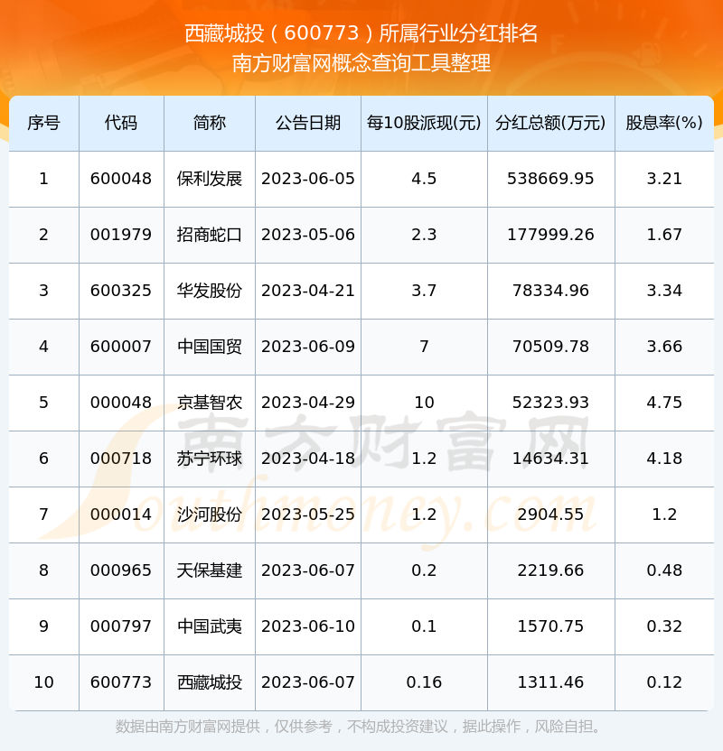 按照南方財富網(wǎng)趨勢選股系統(tǒng)統(tǒng)計,西藏城投所屬行業(yè)為房地產(chǎn)開發(fā)行業(yè),房地產(chǎn)開發(fā)行業(yè)分紅排名情況如下表: