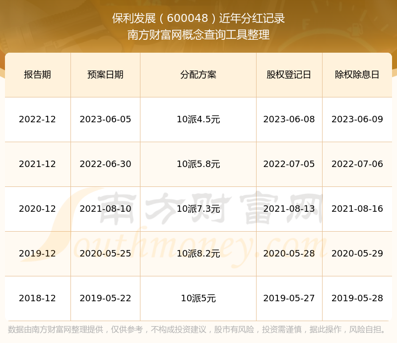 保利發(fā)展最新一次公布的分紅方案為10派4.5元。本次權(quán)益分派股權(quán)登記日為2023年6月8日,除權(quán)除息日為2023年6月9日,派息日為2023年6月9日。