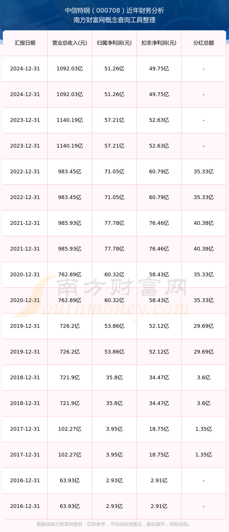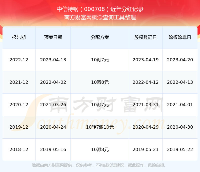 中信特鋼最新一次公布的分紅方案為10派7元。本次權(quán)益分派股權(quán)登記日為2023年4月19日,除權(quán)除息日為2023年4月20日,派息日為2023年4月20日。