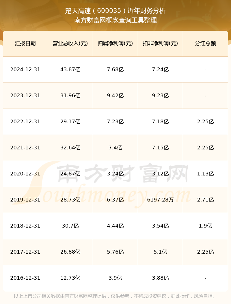 楚天高速2024年總營收43.87億,同比增長37.27%;凈利潤7.68億,同比增長-18.53%;銷售毛利率32.2%。