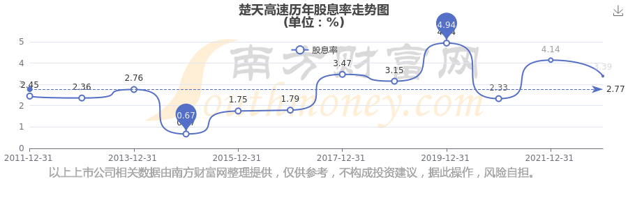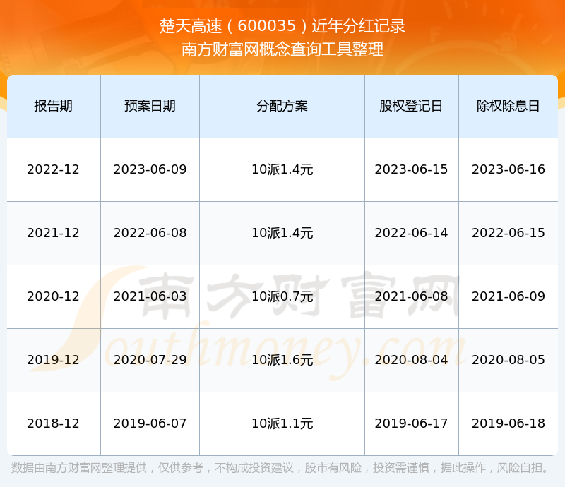 楚天高速最新一次公布的分紅方案為10派1.4元。本次權益分派股權登記日為2023年6月15日,除權除息日為2023年6月16日,派息日為2023年6月16日。