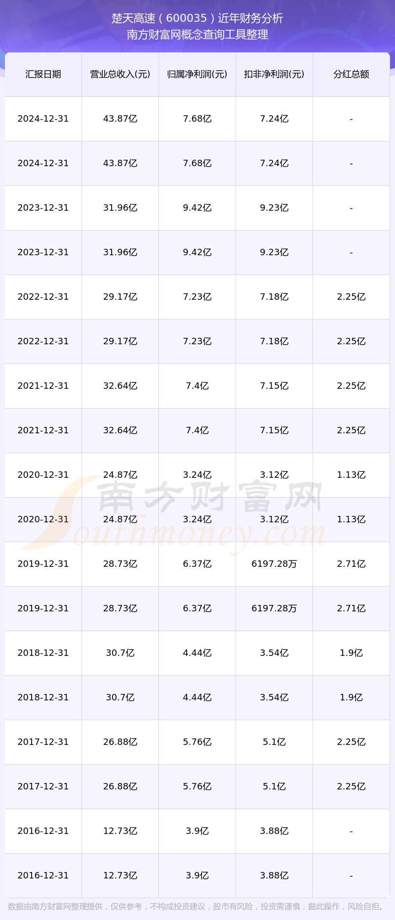 2024年報顯示,楚天高速實現(xiàn)營收43.87億,同比增長37.27%;凈利潤7.68億,同比增長-18.53%;毛利率32.2%。