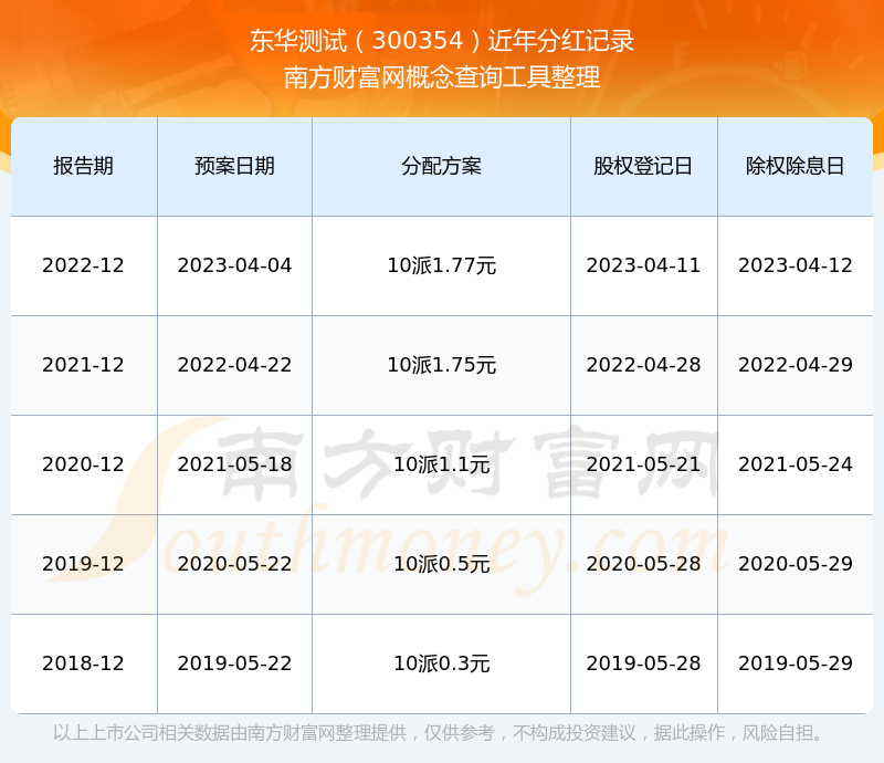 東華測試最新一次公布的分紅方案為10派1.77元。本次權(quán)益分派股權(quán)登記日為2023年4月11日,除權(quán)除息日為2023年4月12日,派息日為2023年4月12日。