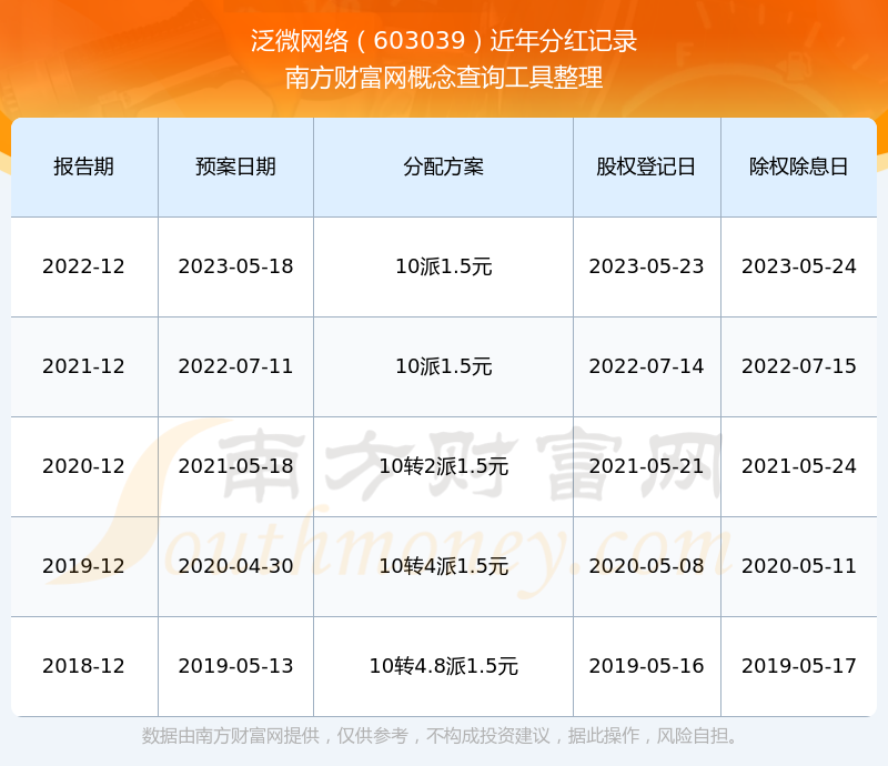 泛微網(wǎng)絡最新一次公布的分紅方案為10派1.5元。本次權(quán)益分派股權(quán)登記日為2023年5月23日,除權(quán)除息日為2023年5月24日,派息日為2023年5月24日。