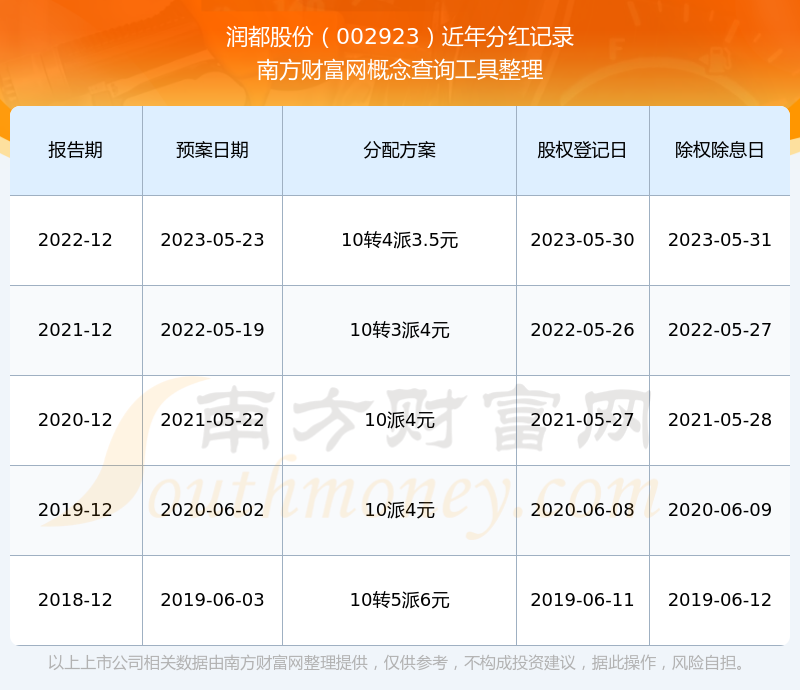 潤都股份最新一次公布的分紅方案為10轉(zhuǎn)4派3.5元。本次權(quán)益分派股權(quán)登記日為2023年5月30日,除權(quán)除息日為2023年5月31日,派息日為2023年5月31日。