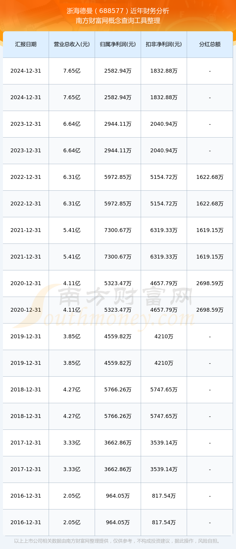 2024年浙海德曼總營收7.65億,同比增長15.31%;凈利潤2582.94萬,同比增長-12.27%;銷售毛利率25.08%。