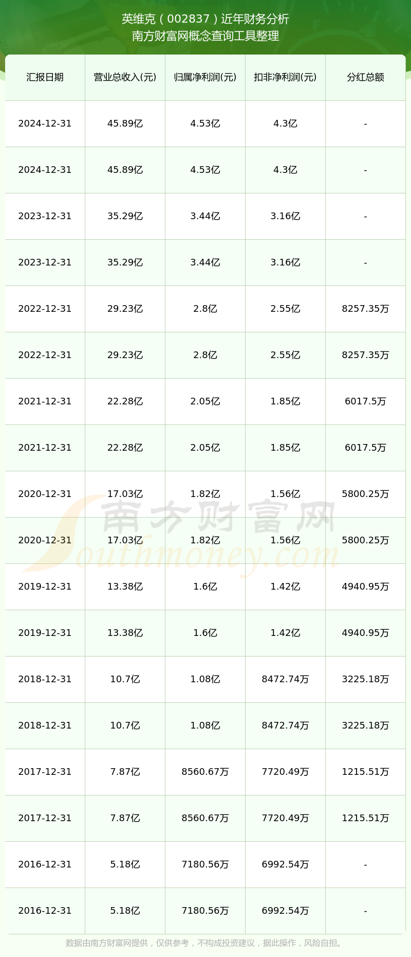 英維克歷年分紅派息情況如下表所示: